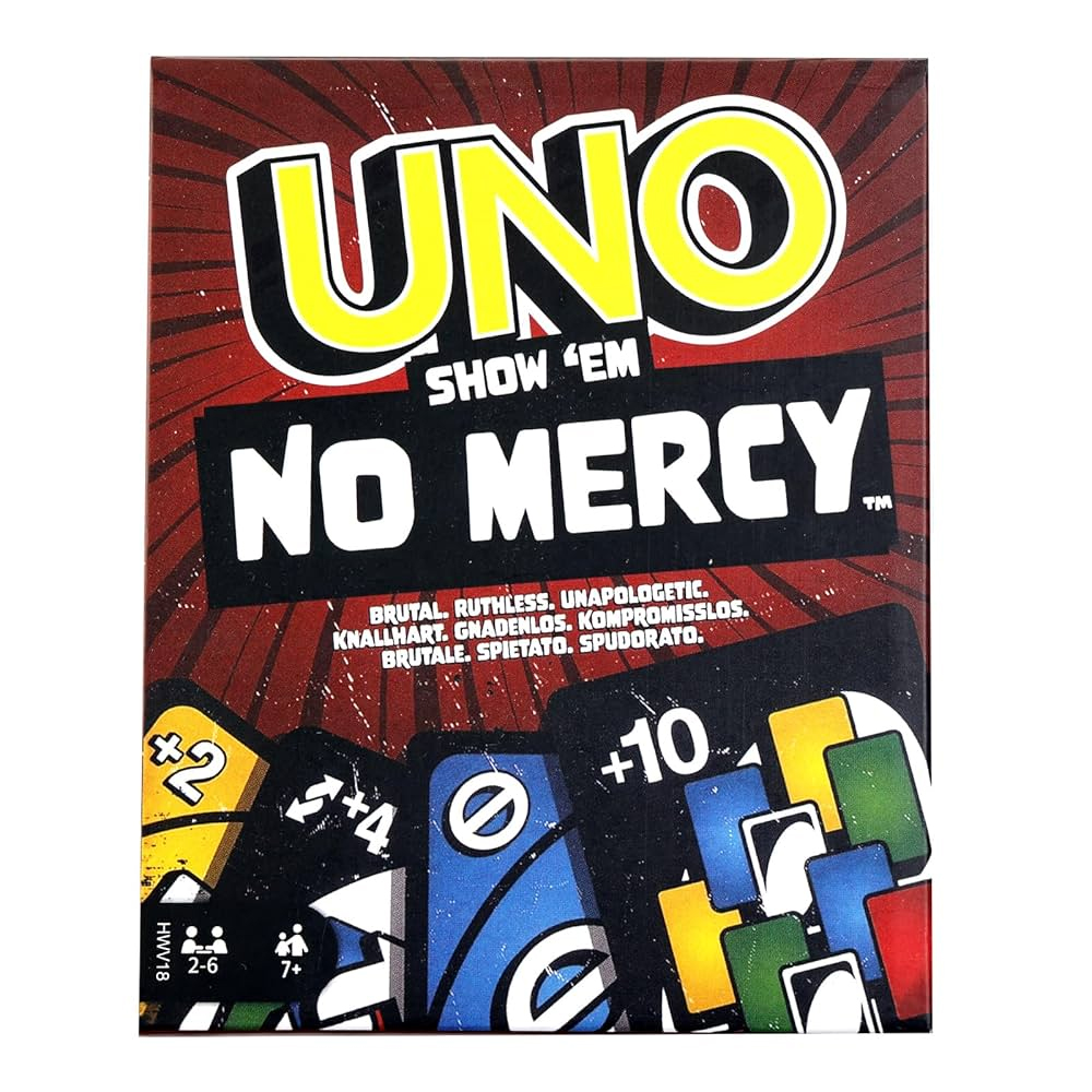 Preparati alla sfida più estrema con UNO Show ’em No Mercy, l’edizione più spietata di UNO! Con 56 nuove carte, regole speciali e Carte Azione potentissime come Salta Tutti, Jolly Pesca 6 e Jolly Pesca 10, ogni partita diventa una battaglia senza esclusione di colpi. La nuova regola dell’accumulo ti permette di passare le penalità ai tuoi avversari, mentre le carte 7 e 0 ti obbligano a scambiare le mani con altri giocatori. E attenzione: con la regola “Senza pietà”, chi ha 25 o più carte è fuori dal gioco! UNO Show ’em No Mercy è perfetto per chi ama il brivido e vuole portare il divertimento a un livello completamente nuovo.
