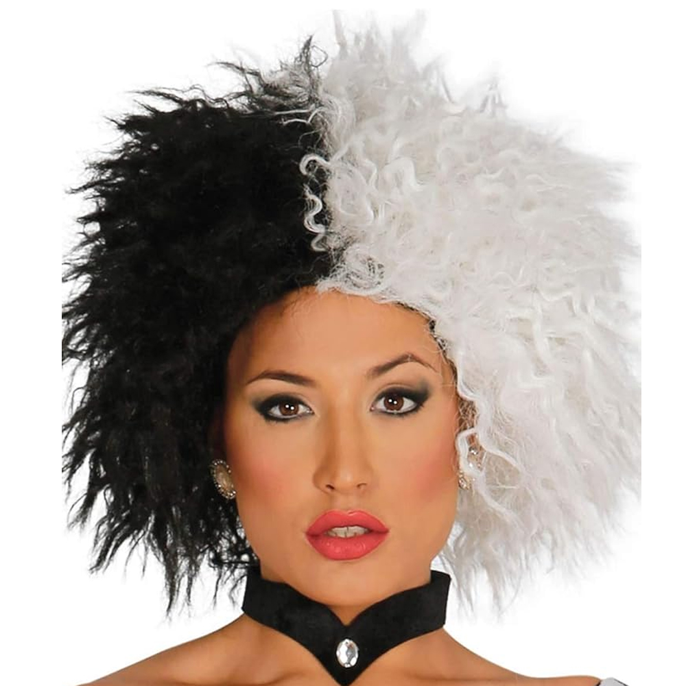 Parrucca bianca e nera per donna, perfetta per Halloween e anni ’50. Ideale per feste a tema, un look elegante e originale per tutte le tue celebrazioni.