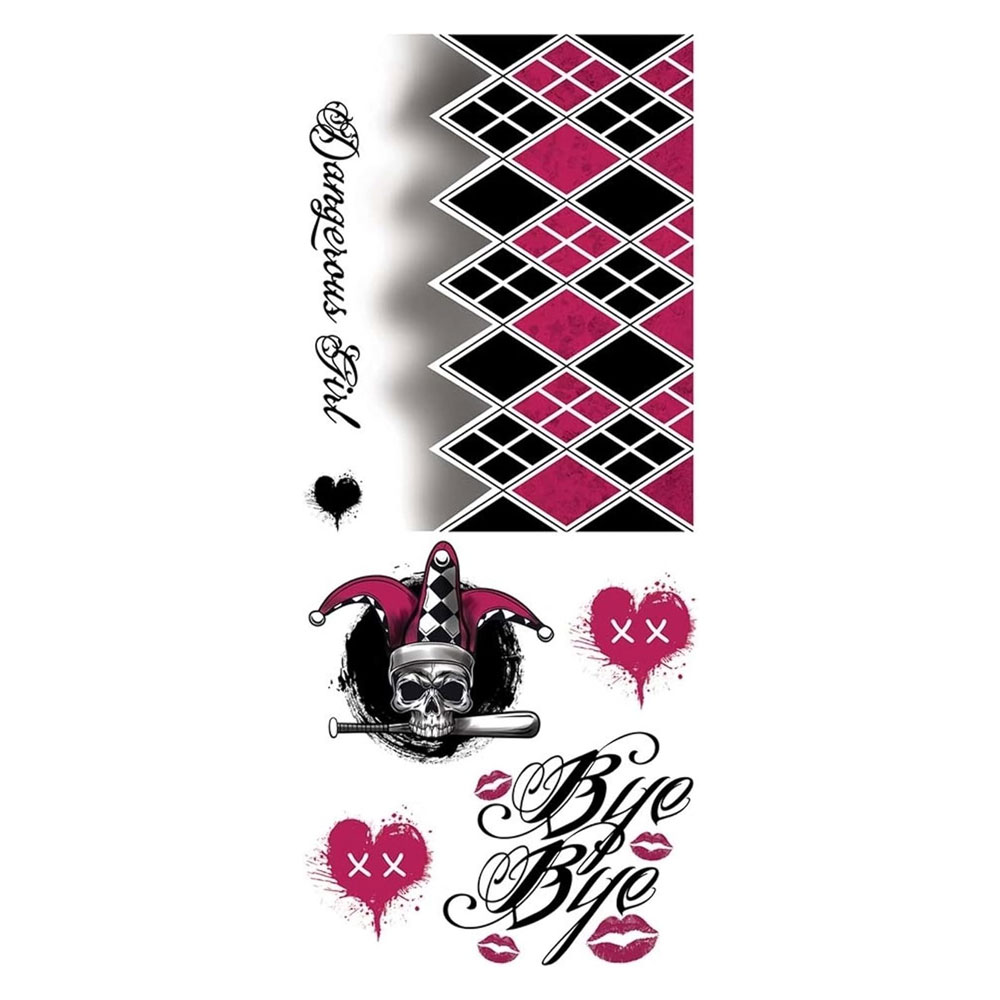 Tatuaggi giullare ragazza cattiva e pericolosa, 30×14 cm. Perfetti per look audaci e provocanti, ideali per Halloween e feste a tema!